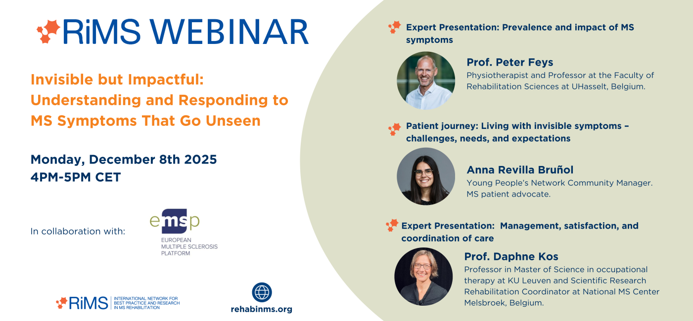 Many of the most debilitating symptoms of Multiple Sclerosis—such as fatigue, pain, and cognitive difficulties—remain invisible to others, yet profoundly impact daily life. Join us for an insightful webinar organised by RIMS and EMSP exploring the findings of EMSP’s recent IMSS (Impact of Multiple Sclerosis Symptoms) survey and discussing how healthcare professionals and the MS community can work together to better address these hidden challenges.