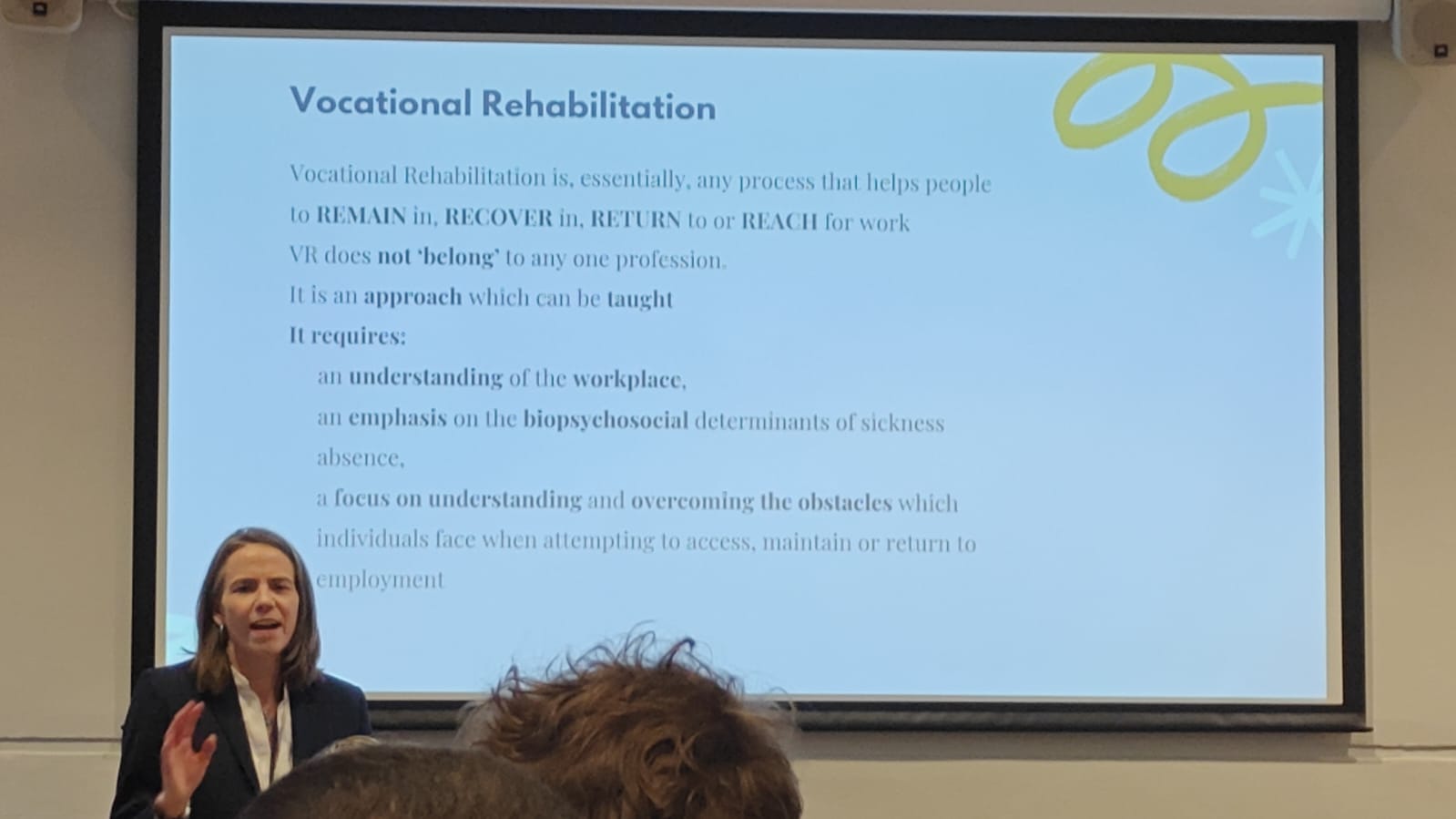 Emma Rogan, brain-health campaigner and Disability Management Expert, presented research on staying professionally active with MS. As a Research Assistant at the University of Galway working on cognitive occupation-based programmes, Emma shared data showing that early return-to-work with modified job activities correlates with faster recovery and better long-term employment outcomes. Her presentation emphasised the bio-psycho-social model—that mental health, physical health, community engagement, and cultural pursuits all influence professional capacity. The session gave participants tools to identify early warning signs that workplace needs aren’t being met, before reaching burnout or crisis points.