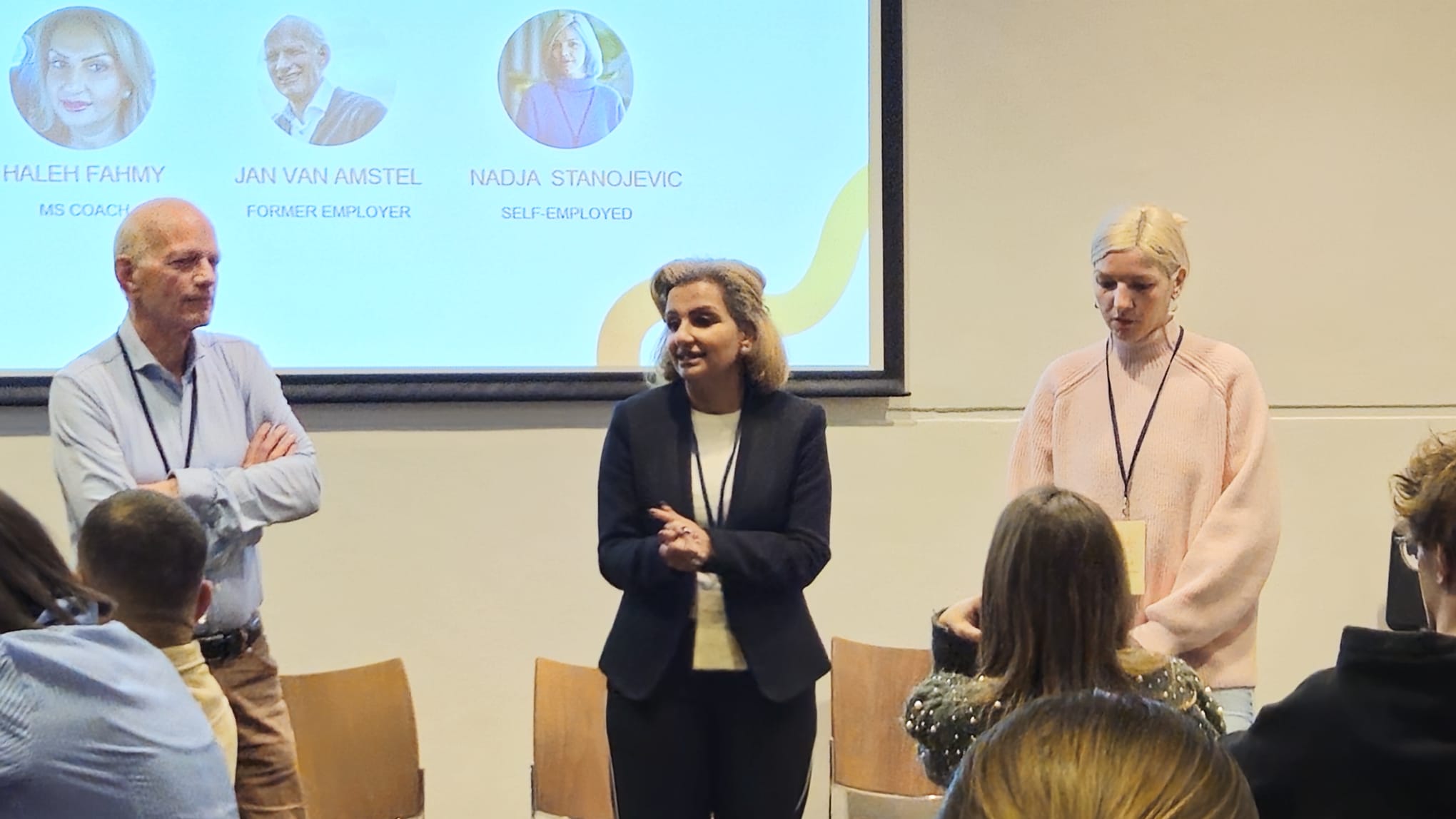 A panel discussion moderated by EMSP Community Coordinator, Anna Revilla, featured Nadja Stanojevic (self-employed, YPN member), Haleh Fahmy (MS Coach), and Jan van Amstel (former hospital director with 25+ years managing approximately 1,000 employees per facility, and father of a daughter with MS). The diverse perspectives showed how accommodation conversations differ across employment contexts—from entrepreneurship to corporate environments.